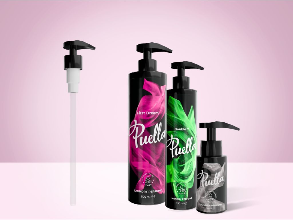 Dávkovacia pumpička pre fľaše Puella 50 / 250 / 500 ml – vhodná na pracie gély a parfumy na pranie v týchto objemoch.