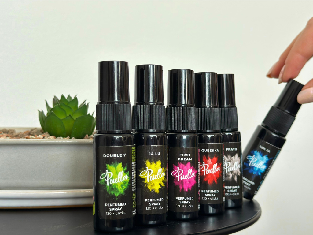 UNIVERZÁLNY BYTOVÝ PARFUM. Puella vône v podobe sprejov na každodenné použitie. Špeciálny parfum vyvinutý pre domácnosť. Vhodné na textil, gauč, do auta alebo na prevoňanie interieru. Nebezpečenstvo! Zloženie: Benzyl-salicylát, 1-(1,2,3,4,5,6,7,8-oktahydro-2,3,8,8-tetrametyl-2-naftyl)etan-1-on, hexyl-škoricový aldehyd, piperonal, linalool, linalyl-acetát, 2-metyl-3-(3,4-methylendioxifenyl)propanal. Môže vyvolať alergickú kožnú reakciu. Škodlivý pre vodné organizmy, s dlhodobými účinkami. Uchovávajte mimo dosahu detí. Ak sa prejaví podráždenie pokožky alebo sa vytvoria vyrážky: vyhľadajte lekársku pomoc/starostlivosť. Odstráňte obsah/obal podľa štátnych predpisov.