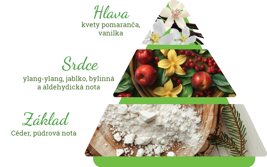 Vôňa, ktorá prináša zmyselnosť a eleganciu v jednom. Otvára svoje brány jemnou vôňou kvetov pomaranča a sladkou, hrejivou vanilkou. Prvý nádych vás okamžite zahalí do závoja jemnosti a tepla. V srdci vône sa rozvíja exotický ylang-ylang v dokonalej harmónii so sviežim jablkom a jemnou bylinnou a aldehydickou notou, ktoré dodávajú vôni moderný a čistý charakter.